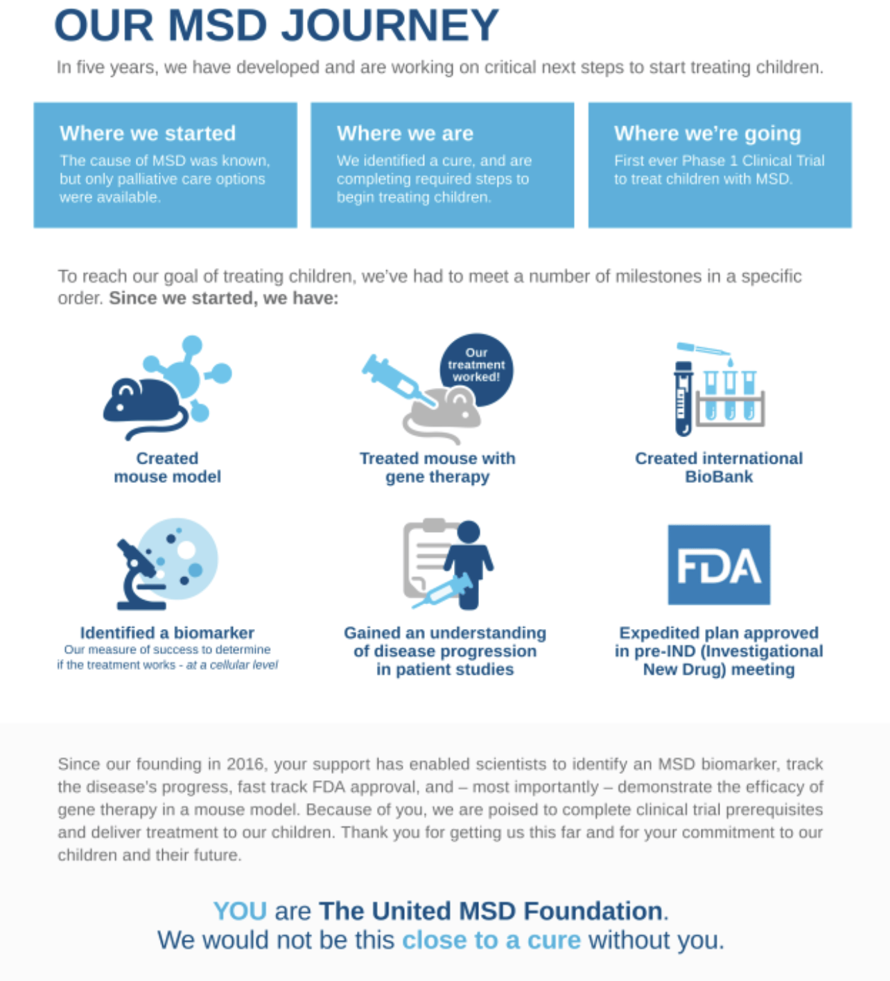 As a mom of four healthy children, I have been extremely touched by the perseverance of MSD parents to save these children with this fatal genetic disorder. These parents and volunteers have moved mountains from no hope, to advancement of gene therapies with a cure in sight.