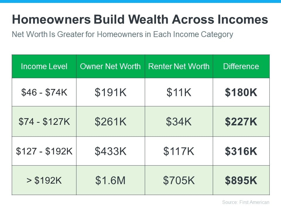 You may be surprised to learn homeowners across various income levels have a much higher net worth than renters who make the same amount. Data from First American helps illustrate this point (see graph below):