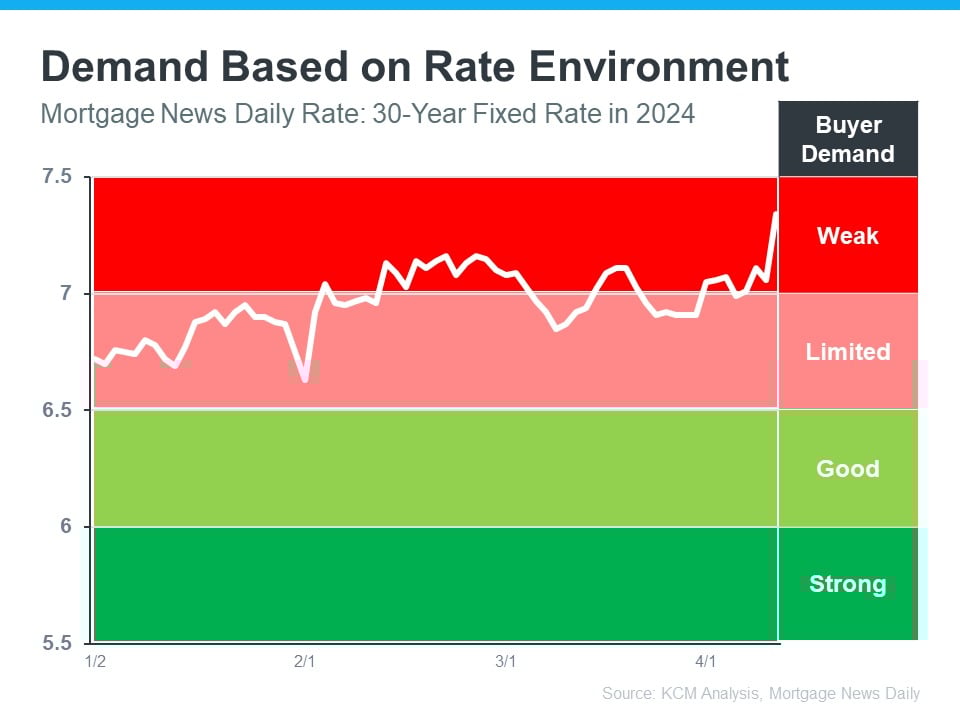 But when rates start to come down, things change. It goes from limited or weak demand to good or strong demand. That’s because a big portion of the buyers who sat on the sidelines when rates were higher are going to jump back in and make their moves happen. The graph below helps give you a visual of how this relationship works and where we are today: