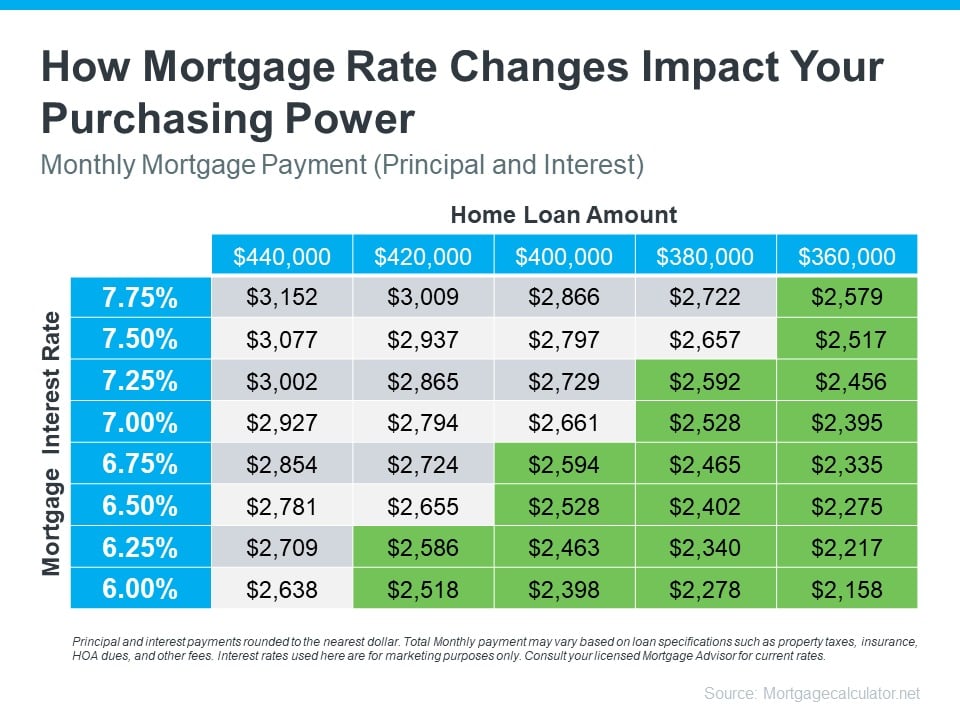 Take this chart as an example. It gives you an idea of how mortgage rates impact your monthly payment when you buy a home. Imagine being able to make a payment between $2,500 and $2,600 work for your budget (principal and interest only). The green part in the chart shows payments in that range or lower based on varying mortgage rates (see chart below):